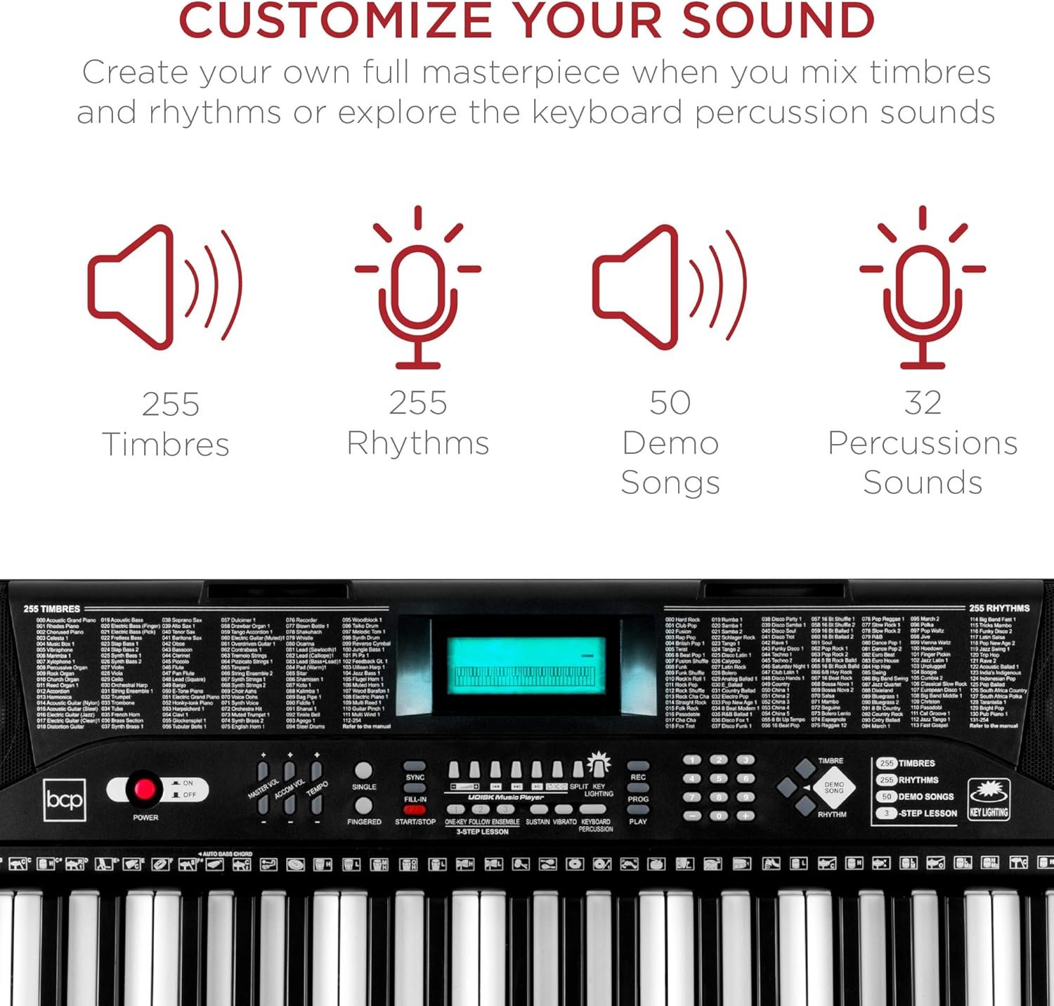 STANDARD SIZE ELECTRONIC KEYBOARD: Complete with 61 keys, 255 timbres, 255 rhythms, 50 demo songs, 32 types of keyboard percussion, and a starting tempo of 120 BPM