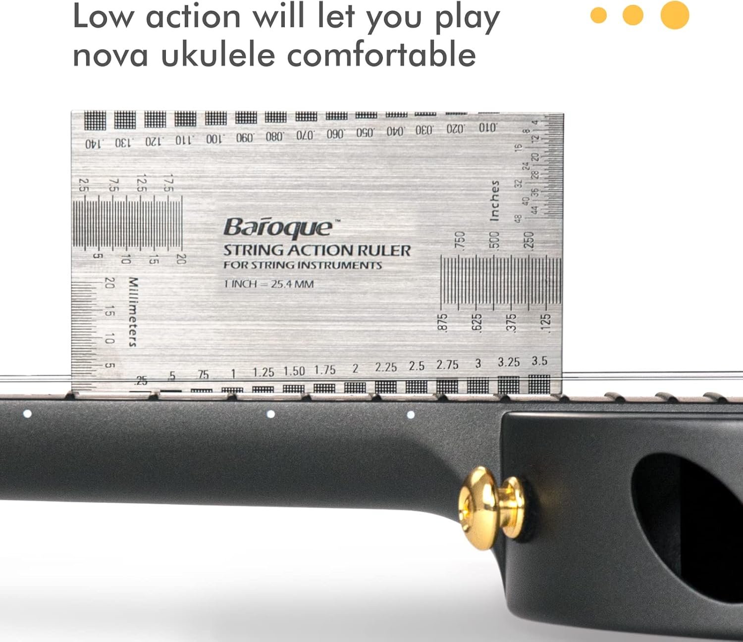 Depending on the ukulele, we like to set the action at 2.5mm to 3.0mm in height. This is the distance between the strings and the 12th fret. If the strings are too high, the instrument becomes uncomfortable to play. Nova U action is between 2.5mm so that we can play it comfortably.
