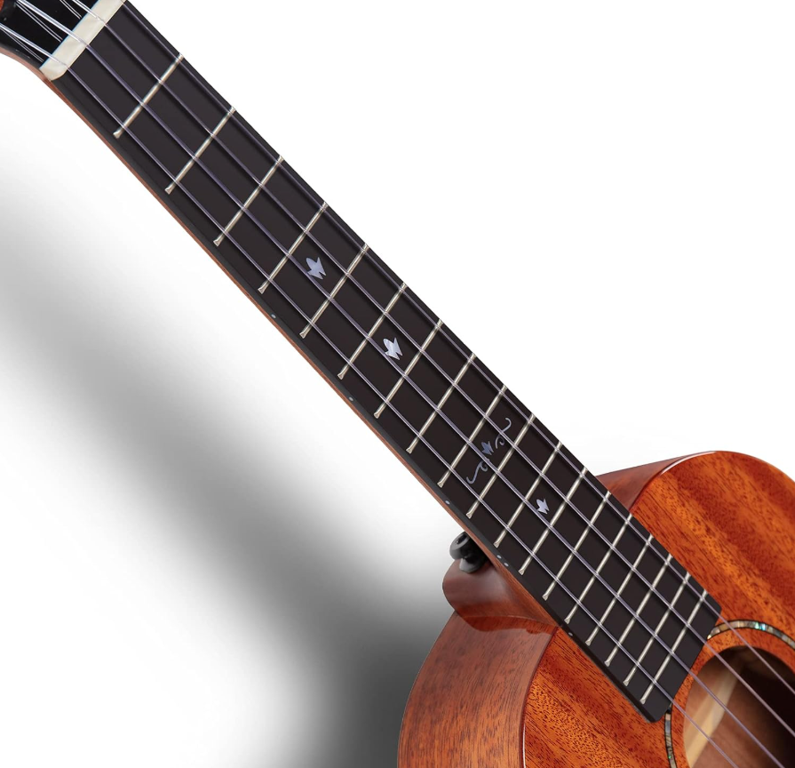 • ♫ Mother of pearls soundhole decoration. It has a drill through black richilite bridge . It allows the strings to directly touch the instrument so that it resonates right to the tonewood.