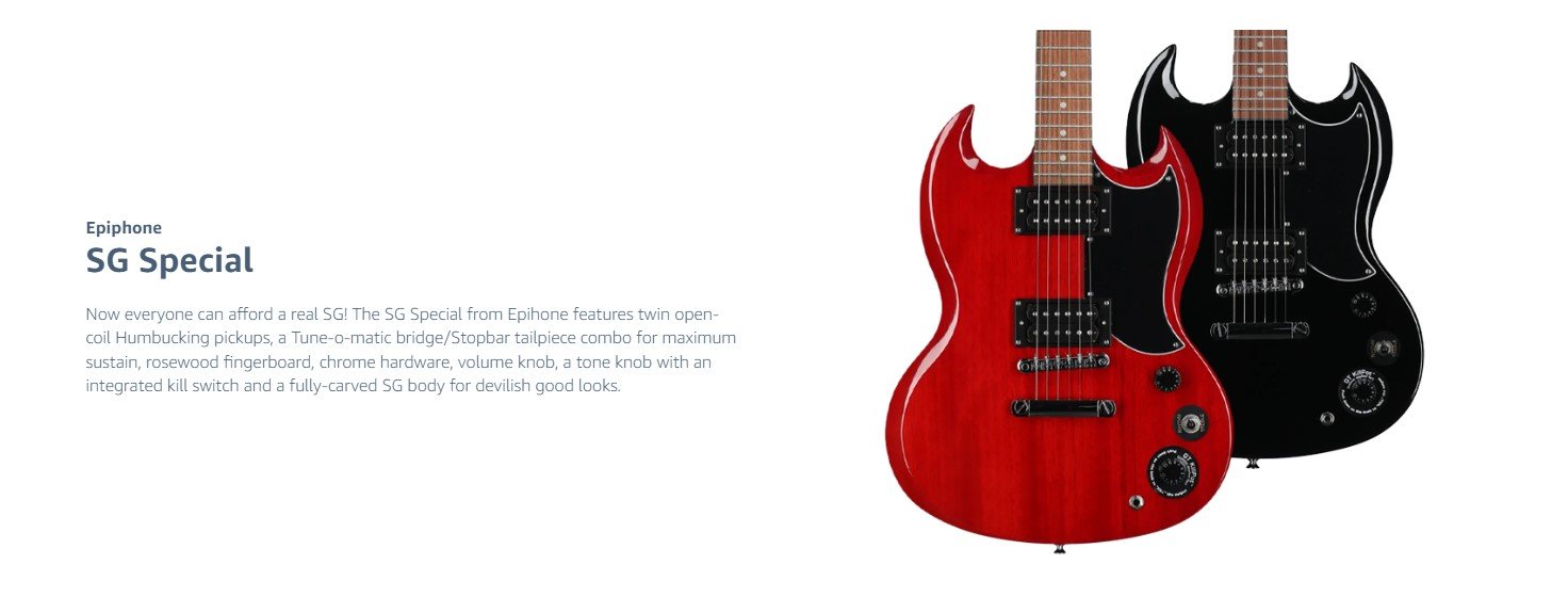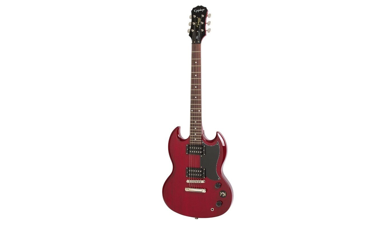 Now everyone can afford a real SG! The SG Special from Epihone features twin open-coil Humbucking pickups, a Tune-o-matic bridge/Stopbar tailpiece combo for maximum sustain and a fully-carved SG body for devilish good looks.