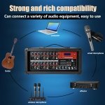 6-channel powered mixer features blutooth function to instantly pair with iPhone,iPod,iPad,android devices, etc with line of sight of up to 66 feet.;Built-in USB drive interface also allows to connect PC to playback MP3 files. Compatible with condenser mic/dynamic mic/guitars.Individual volume controls, +48V phantom button, RCA input&output.