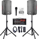EXOTON S-1202 mixer and passive speaker set comes with (1) 6-channel powered bluetooth mixer, (2) 12 inch passive speakers (2) Rugged tripod speaker stands, (1) Wired microphone. (2)1/4″ Cable for mixer to connect passive speakers, (1) power cable, (1) manual. The set has 400Watts RMS / 700 Watts Program Power / 2000 Watts Peak.