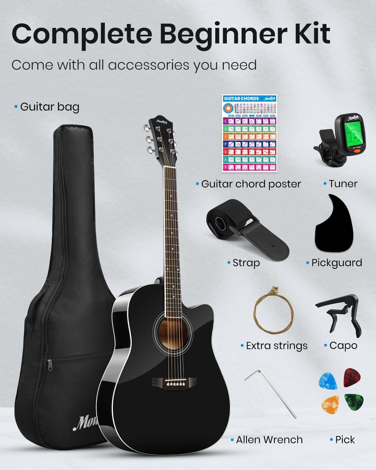 Complete Beginner Guitar Pack – Everything needed for starters is included, just unbox & play. The bundle includes Moukey 41” acoustic guitar, chord poster, 3mm padded gig bag, tuner, strap, capo, strings and picks. A decent gift for children, friends and family.