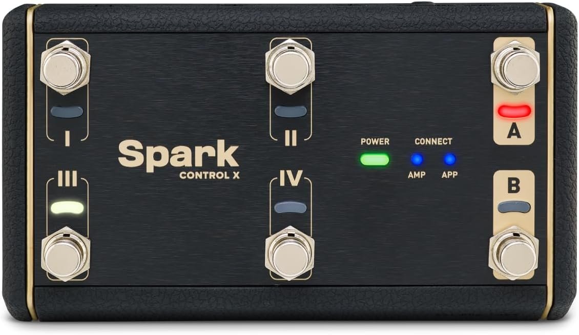 Official wireless footswitch for Spark series guitar amps featuring 6 customizable switches, enhanced functionality, and a range of advanced customization features. Spark (40-Watt), Spark MINI, and Spark GO require Spark app connection.