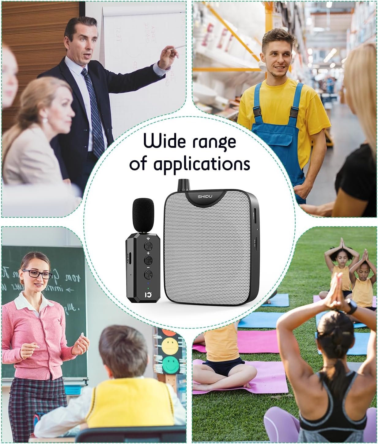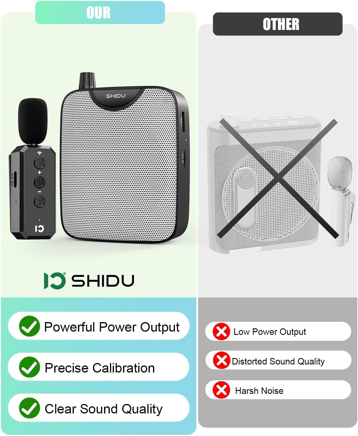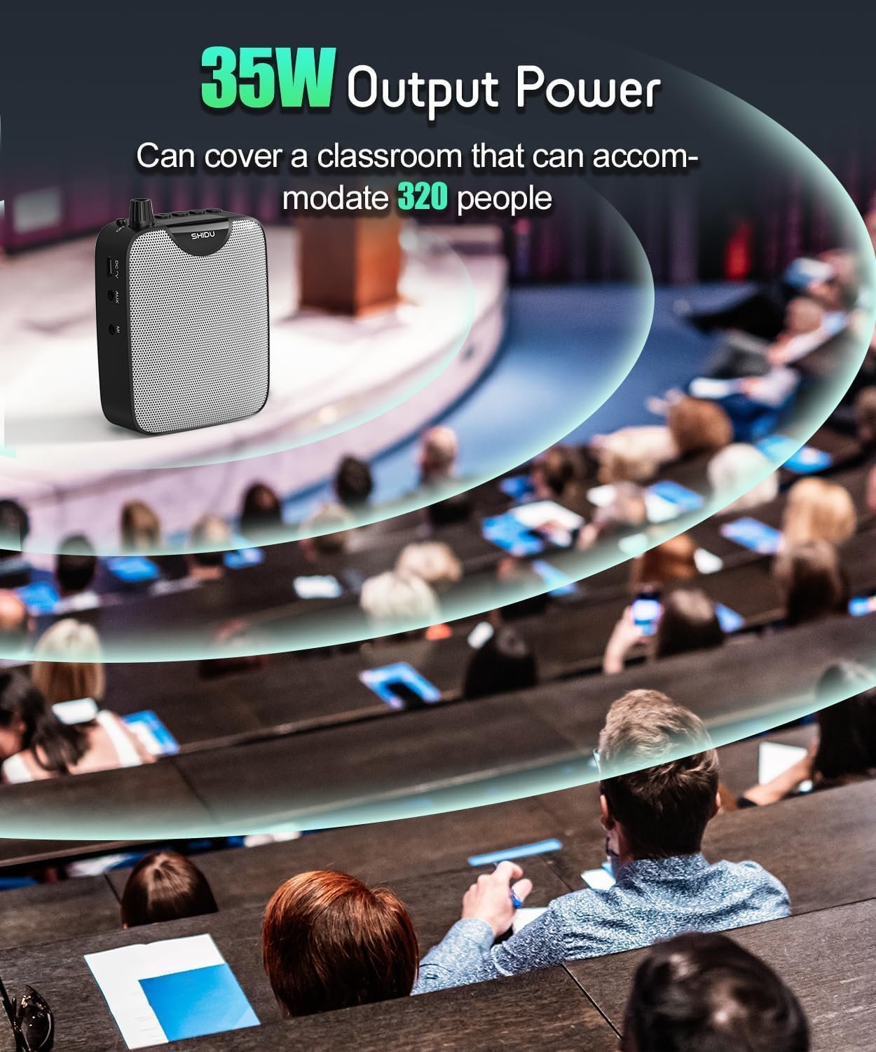 【 True Acoustic Power Amplifier 】SHIDU 35W wireless voice amplifier is paired with a 2.4G lavalier microphone, which has more advanced sound sensitivity and stronger sound penetration, stable connection and no noise, and can cover a large classroom of about 22,604 square feet (2100㎡) with 320 people.