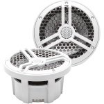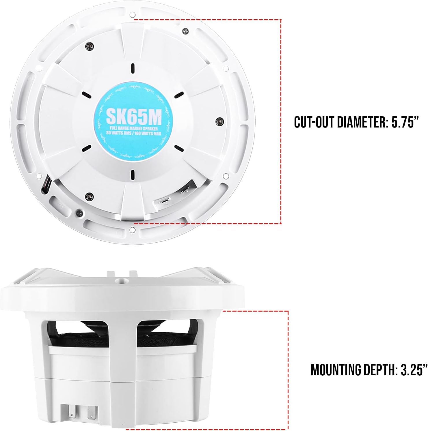 The Skar Audio SK65M 2-way, 6. 5 inch, marine full-range coaxial speaker system is perfect for upgrading the sound in your boat, UTV, 4-wheeler, or motorcycle. Sold as a pair, these 6. 5 inch marine speakers are capable of some serious power output, with a conservative max power rating of 320 watts for the pair. This means everyone out on the water or trails will hear you coming from a distance, with extreme sound clarity. Not only do these speakers get loud and sound excellent while doing so, they are built to withstand the harshest of marine environments. If you are looking for marine speakers that will withstand the test of time, look no further, the SK65M’s are exactly what you need. The SK65M’s feature a unique and seamless 2-way design – in which the highly efficient silk dome, marine grade tweeter, sits atop the mid-range speaker, for perfectly balanced and clear sound reproduction. Furthermore, the marine housing that encompasses this two way design not only serves to better protect the speakers, but also allows the mid-range portion of the speaker to develop more accurate and dynamic, full-range sound. Sold as a pair – includes 2 speakers. Speaker color: White. Sensitivity: 88 dB, 4 Ohm Impedance, 1. 2″ SV Voice Coil, Frequency Response: 57 Hz-20 kHz. Speaker Mounting Depth: 3. 25″, Cutout Diameter: 5. 75″, Outside Diameter: 7. 00″, Max Power: 320 Watts (160 Watts per speaker), RMS Power: 160 Watts (80 Watts per speaker).