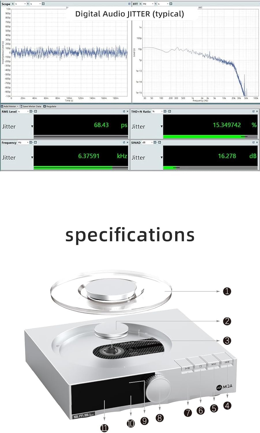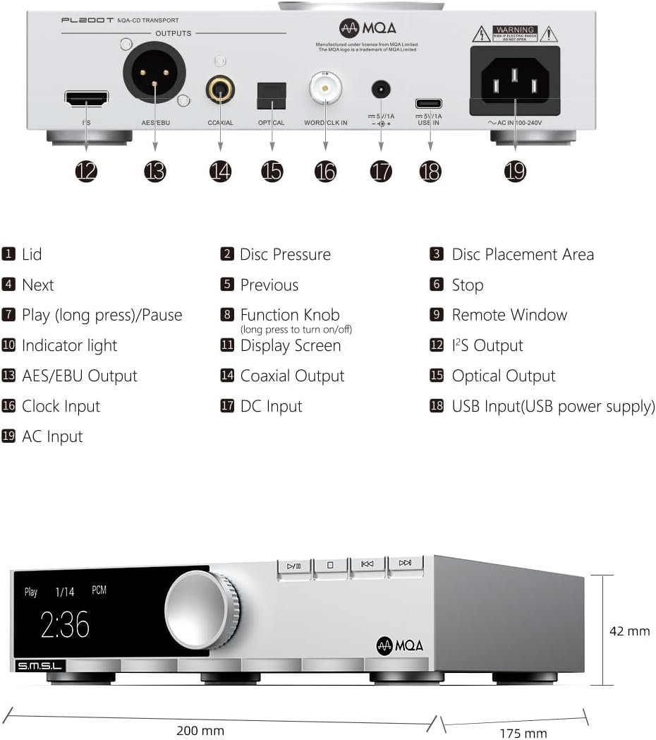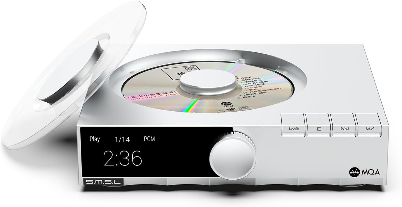 Three modes of power supply. Self-developed precision Access servo system, native support for MQA-CD. The servo system developed by SMSL over two years features fast response and precise reading capabilities. Combined with their self-developed vibration damper, it offers excellent mechanical anti-vibration performance! Support MQA full decoding.