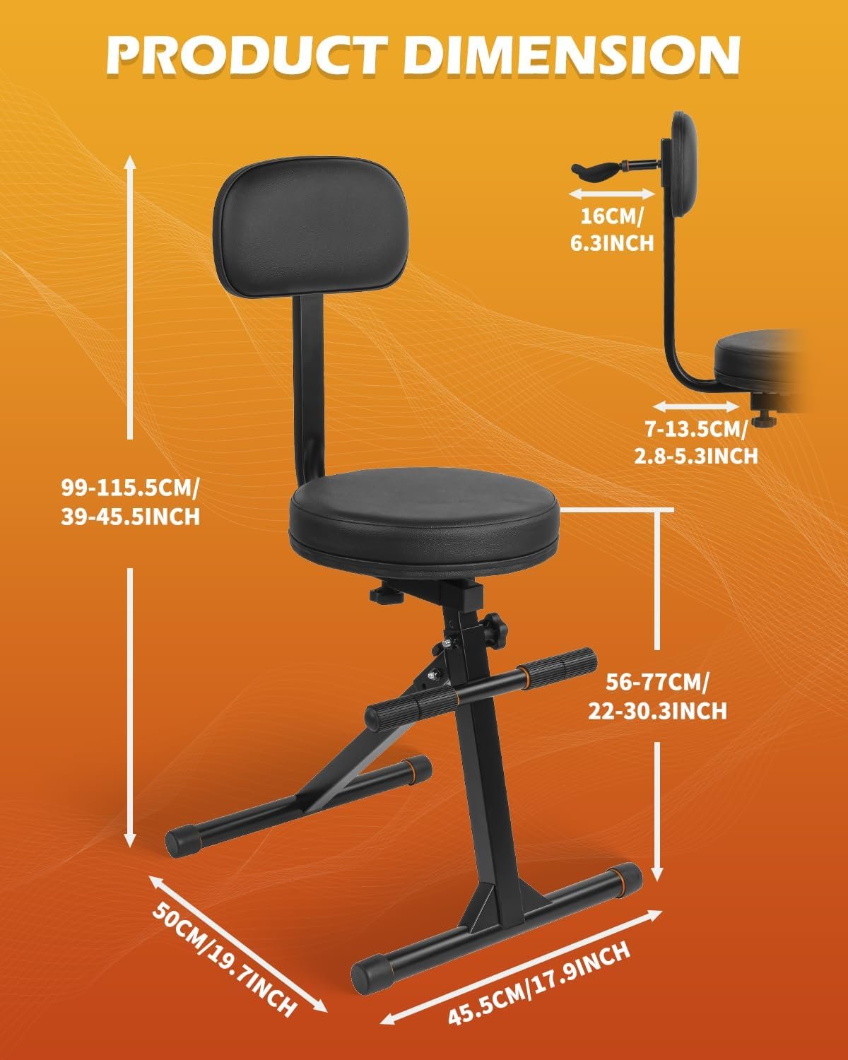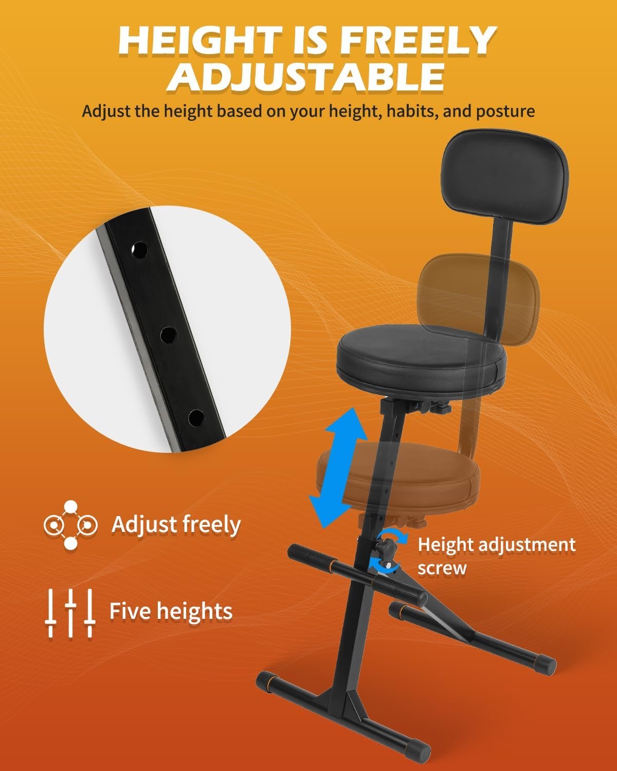 【Versatile Height Options】The STRICH guitar stool provides five adjustable seat heights, letting you customize it to your ideal level for various playing situations and positions. With a height range of 38.2“ to 46.9” , it accommodates players of all sizes. Additionally, the backrest offers two adjustable distances, from 2.8“ to 5.3” , allowing you to choose between a relaxed or upright sitting posture.