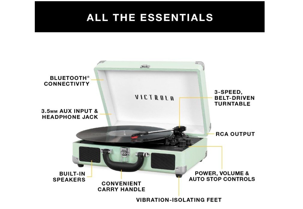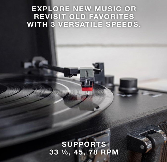 THREE SPEED BELT-DRIVEN TURNTABLE – This 3-speed (33 1/3, 45, 78 rpm) suitcase record player features UPGRADED PREMIUM SOUND QUALITY and sits on sound isolating feet that prevent vibration. It is perfect for your living room, bedroom or office.