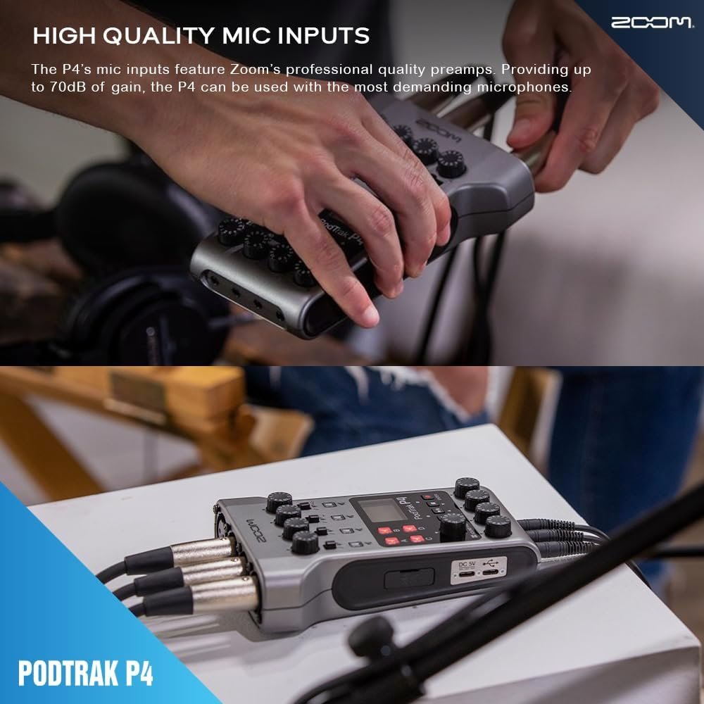 Versatile Mic Inputs: The Zoom P4 Podtrak features four mic inputs with XLR connectors, providing professional-grade audio capture for podcasting and recording sessions. This essential zoom podcast equipment bundle ensures high-quality sound from multiple sources.