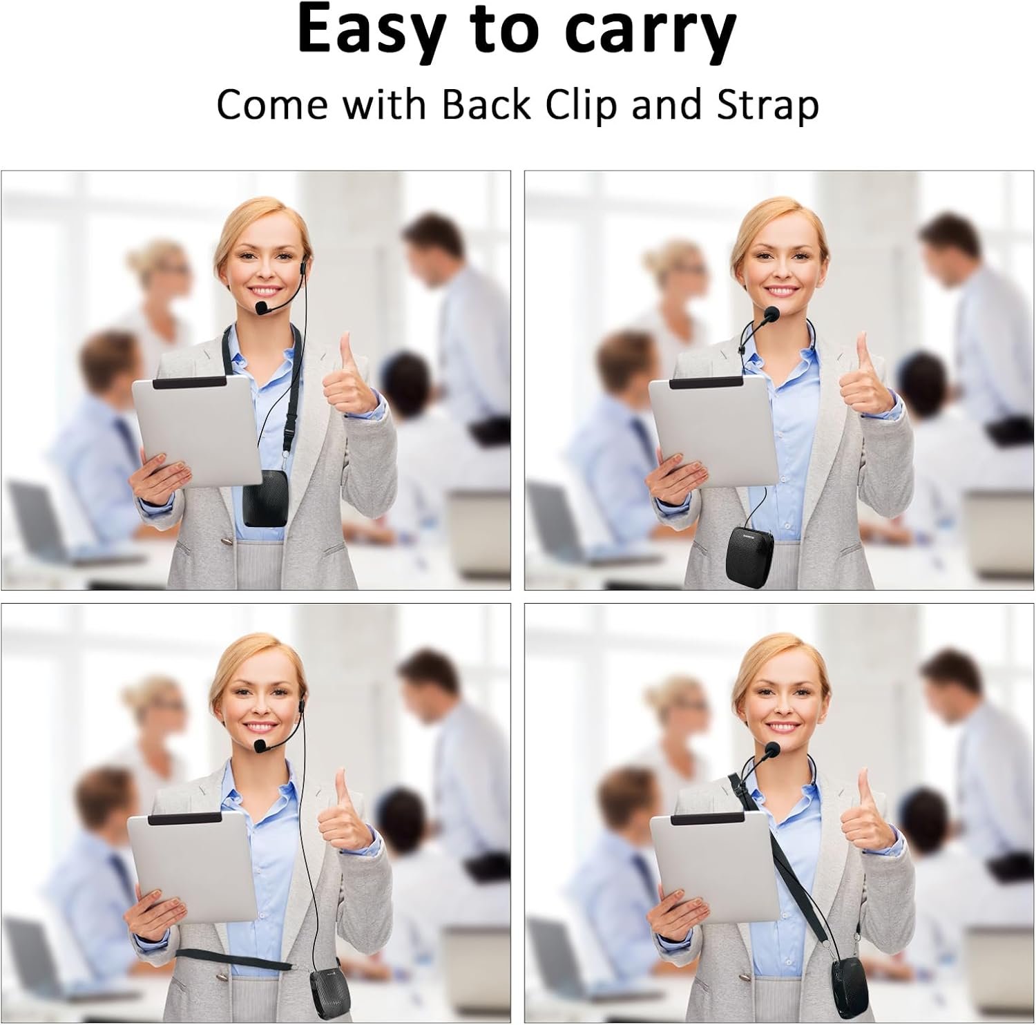 Portable Voice Amplifier Compact size (4. 1 x 1. 4 x 3. 4 inches) and light weight (0. 36 lb.). You can use the back clip to fix it on your belt or pocket. You can also use waistbelt to tie it around your waist or hang it on your neck